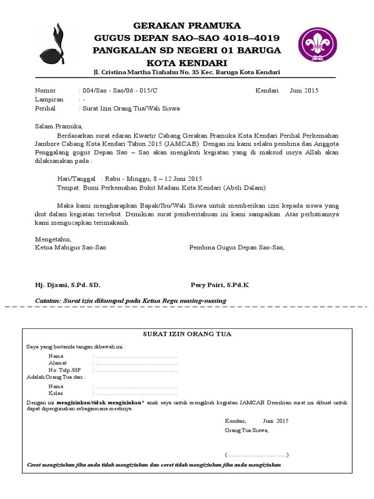 Contoh surat permohonan latihan gabungan pramuka . Download contoh surat izin kemah untuk orang tua. 13.00 wib s/d selesai tempat : Contoh surat izin orang tua untuk lomba pramuka i. Doc proposal perkemahan pelantikan pramuka penggalang safii.